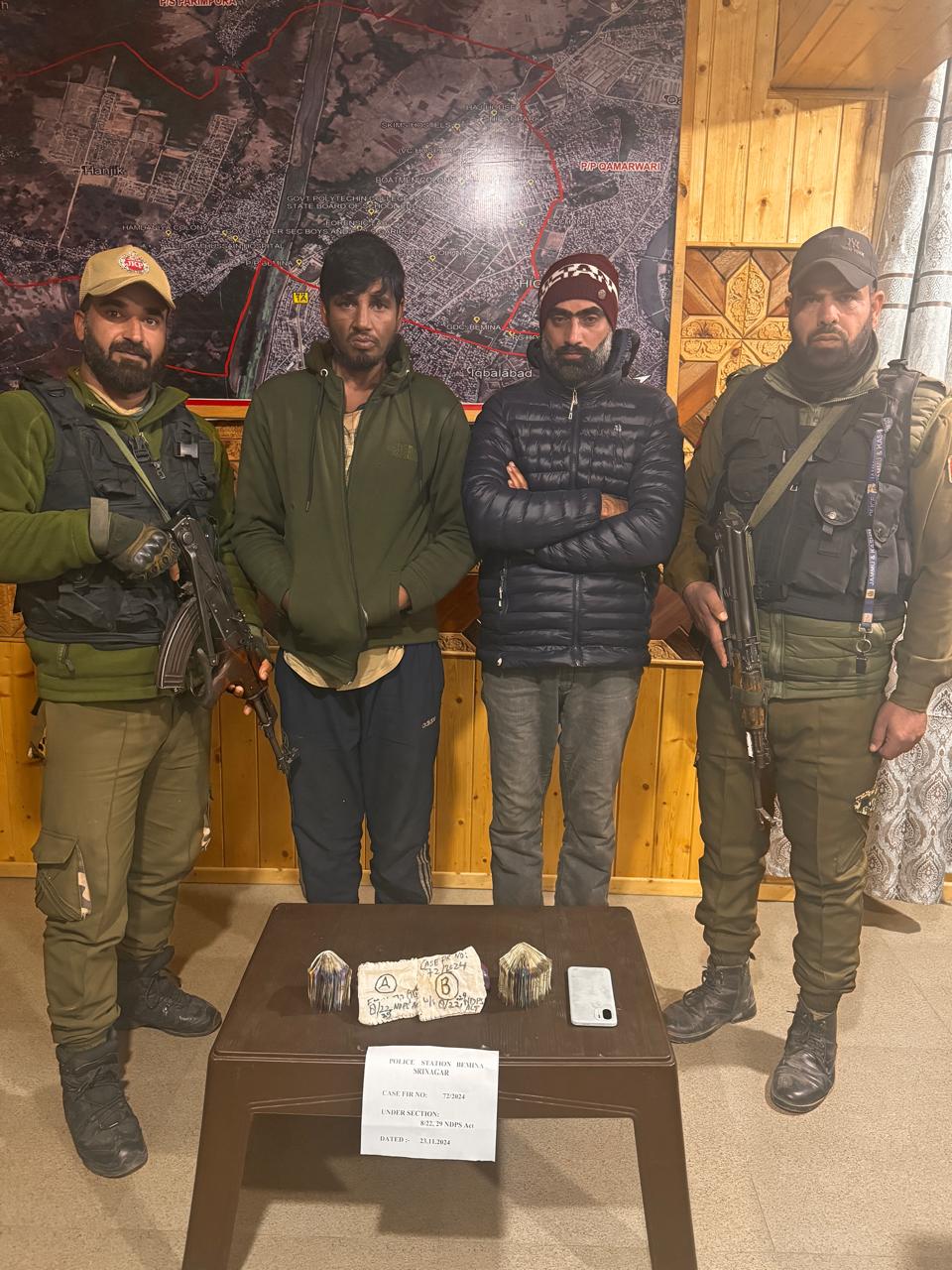 سری نگر پولیس کی طرف سے تحصیل آفس سنٹرل شالٹینگ کے سامنے NHW پر قائم ایک ناکہ پر، زیر نمبر JK18-2323 والے ایک ٹرک کو دو افراد کے ساتھ روکا گیا۔ ان کی شناخت تجمل رفیق ولد محمد رفیق ساکنہ کنڈی ٹنگدھر اور منظور احمد خان ولد جلال الدین خان ساکنہ ہیامہ کپواڑہ حال پالپورہ نورباغ سری نگر کے طور پر کی گئی ہے۔ تلاشی کے دوران ان کے قبضے سے 14 گرام براؤن شوگر اور 34,000 روپے کی نقد رقم (جس کا خیال ہے کہ منشیات سے حاصل کیا گیا) برآمد کیا گیا ہے۔ انہیں گرفتار کر لیا گیا ہے اور جرائم میں استعمال ہونے والی گاڑی بھی ضبط کر لی گئی ہے۔