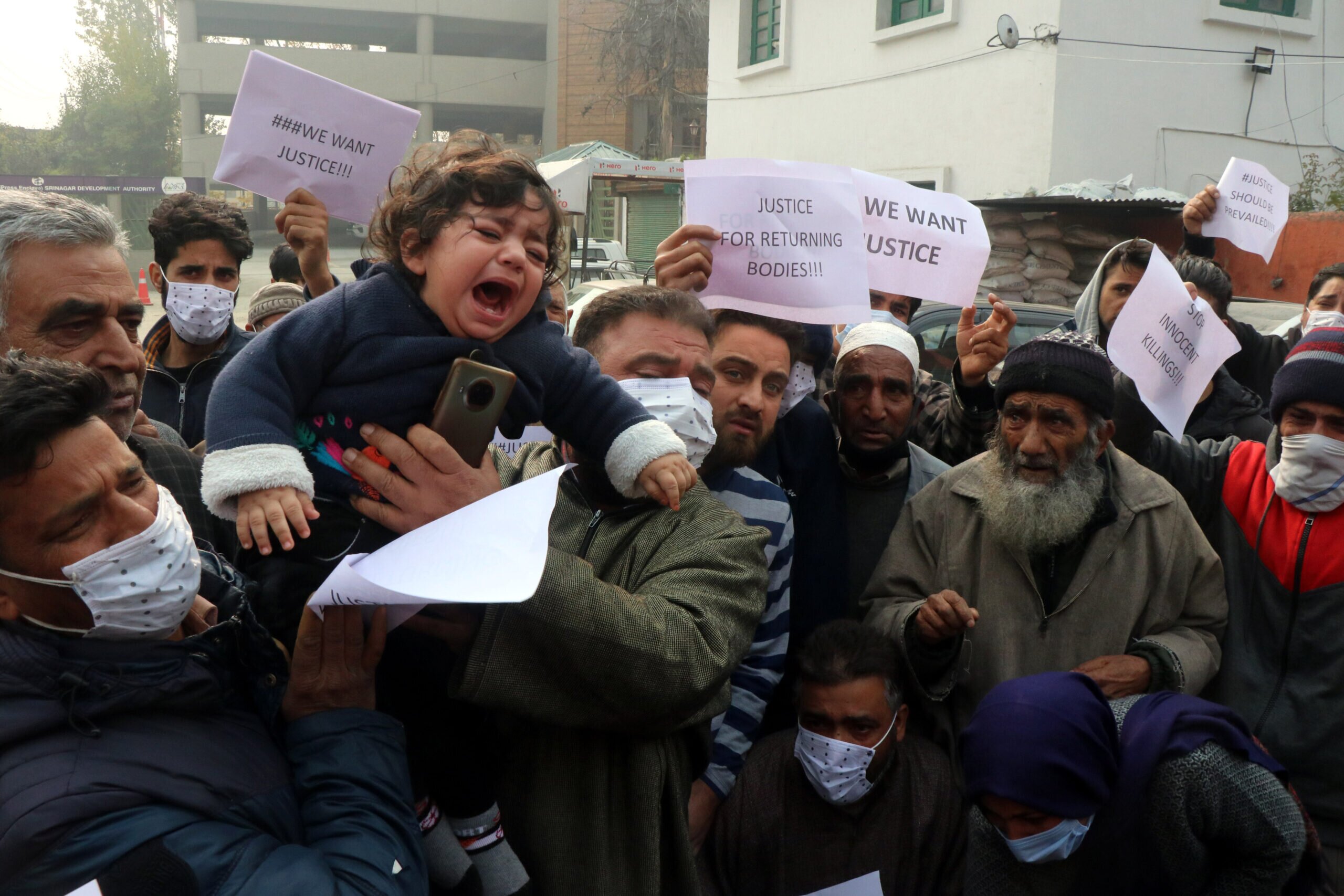 SRINAGAR, NOV 17 (UNI) Families of two men killed in Hyderpora encounter stages a protest in Srinagar and demanded return of the bodies, on Wednesday..UNI PHOTO SRN8.