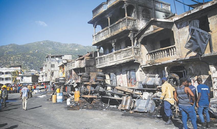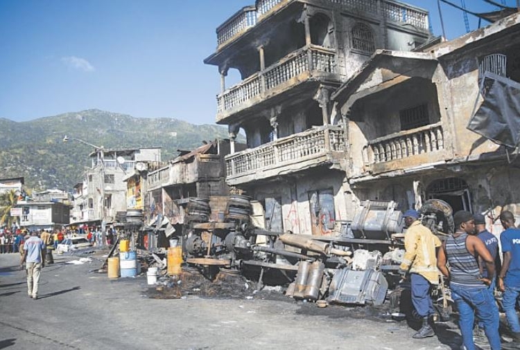 پورٹ او پرنس،15 دسمبر(یواین آئی) ہیٹی میں تیل لے جانے والے ٹینکر میں دھماکے سے 60 افراد ہلاک اور 100 سے زائد زخمی ہوگئے ۔ منگل کے روز ہیٹی کے شمالی شہر کیپ ہیٹن میں موٹر سائیکل ٹیکسی کو بچانے کی کوشش میں ٹینکرڈرائیور کے کنٹرول سے باہر ہو کر اُلٹ گیا ،جس کی وجہ سے تیل ٹینکر سے باہر گرنا شروع ہوا تو مقامی افراد اسے جمع کرنے کے لیے دوڑے ، اسی دوران دھماکہ ہوگیا۔مقامی حکام کے مطابق دھماکے سے اطراف کے 20 گھروں میں آگ لگ گئی جس کی وجہ سے گھروں میں موجود لوگوں کے بھی متاثر ہونے کا خدشہ ہے ۔غیر ملکی میڈیا رپورٹس کے مطابق دھماکے میں ہلاکتوں پر ہیٹی میں 3 دن کے سوگ کا اعلان کیا گیا ہے ۔